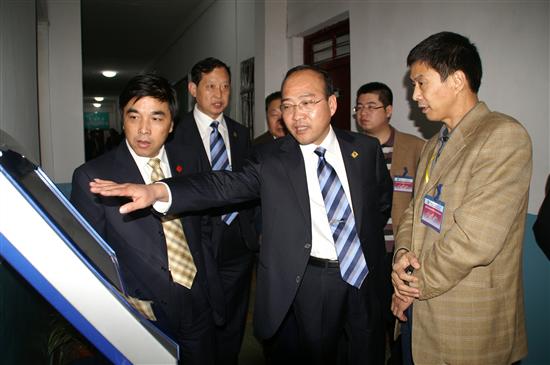 图为这个矿矿长于进广(前)向兄弟矿井的同志介绍考核查询情况。