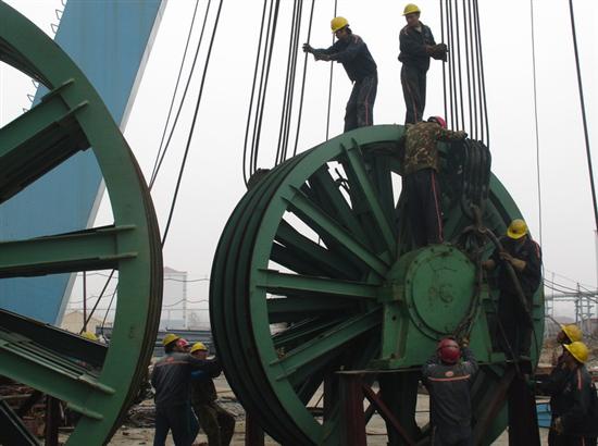 (本网讯)11月6日安徽省淮北矿业集团工程建设公司安创项目部青年突击队队员在青东煤矿副井天轮安装工地精心施工。该公司为发挥团员青年在开发建设新区中的生力军和突击队作用,在团员青年中广泛开展“奉献青春,新井建设青年立功”劳动竞赛活动,以增强他们为集团公司跨越式发展创新、创效、创财富的观念,激励广大青工用自己青春绚丽的色彩为矿区建设蓝图增色添景。