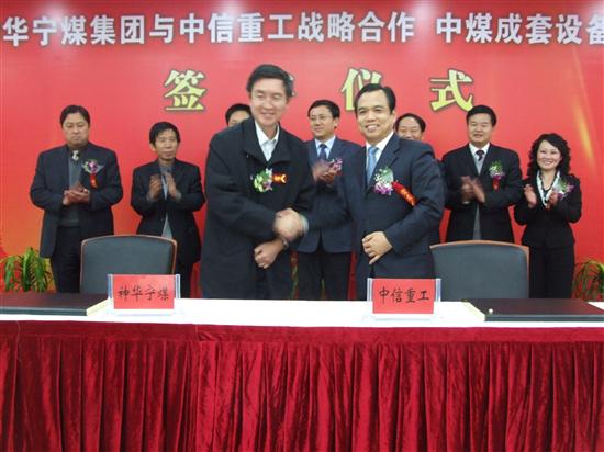 本网讯 12月9日,神华宁煤集团总经理严永胜与中信重工公司总经理任沁新签订战略合作伙伴关系协议书。双方将在成套大型提升机、井下防爆提升机、破碎机等矿山设备方面加强合作。在煤化工、矿山综合自动化、大容量电气传动系统等新领域、新技术和新产品方面组建共同研发项目组,进行新技术的引进和开发,实现技术共同进步。