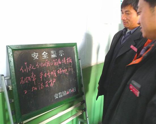 本网讯: 进入今年12月份以来,山东淄矿集团埠村煤矿二号井安监处进一步加大安全监督检查和安全管理力度,在细化落实焊接刚性责任体系、现场开工护照、质量写实、三大员闭合安全管理等安全文化建设载体的基础上,针对以往生产现场特殊地段、地点、环节出现的安全管理难度大、易导致问题发生的实际,认真推行“安全警示牌”制度。图为,该井采二队职工下井前在看安监处对本队施工的3152面溜尾顶板破碎段下达的“安全警示牌”内容,起到了很好的安全警示作用。