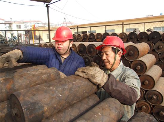 ![]() 图为:孙其峰师傅(右)正和工友码放回收的托辊