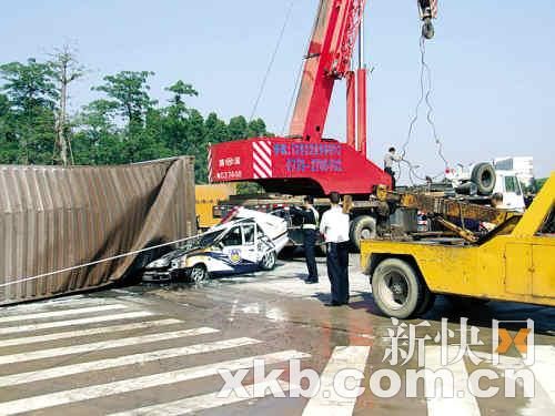 ●时间 昨天上午十时许 ●地点 湛江疏港大道 ●原因 大货车大巴相撞祸及公务车 本报湛江讯 (记者 关家玉 摄影报道)昨日上午10时许,在湛江疏港大道与省道S374交叉路口处,发生了一起重大交通事故:一辆超长大货车侧翻后,货柜掉落并重重压在湛江市检察院一辆执行公务的警车上,致使坐在副驾驶座上的反贪局副局长张建荣当场身亡,另两名干警受轻伤,被送到湛江中心人民医院治疗。 事发后,湛江市交警支队、辖区的麻章交警大队以及湛江市检察院领导、干警等紧急到场善后,同时做好事故现场的勘查等相关工作。截至记者昨晚发稿时,事故的原因仍在调查之中。 检察院警车执行公务中遇祸 记者走近事故现场看见,检察院警车的副驾驶座一侧被翻落的重型货柜死死压住,车头被压扁,车身也严重变形,还有火烧过的痕迹;侧翻后的超长大货车与一辆由徐闻开往广州的大巴正面相撞后,两车车头死死“咬”在一起,均已严重损毁,车前玻璃破碎后散落一地;另有一辆与大巴同方向的的士,车头也被货柜撞上,但损坏不算严重。 据现场一位目击者介绍,事发时,一名民警刚好驾车经过现场并目睹了车祸,该民警当即下车察看,发现驾驶座上的司机和后排座上的另一人受伤并被困在严重变形的警车内,头、脸等部位在流血,于是他发动现场的5名群众,合力拉开已变形的车门,先后将两人救出并扶到路边等待救援。与此同时,该干警迅速用手机拨打了110和120。 警车被压扁后起火冒浓烟 据悉,约三四分钟后,麻章交警大队长谭启瑞与随行的一名民警刚好巡逻经过,谭马上下车了解情况。不久,被压的警车突然冒起大量浓烟并起火,谭见状急忙吩咐并指挥随行民警从大巴上找来灭火器扑救,多名驾车经过的司机见状,也纷纷从各自车内取出灭火器扑救,但只是控制了火情,大火最终由及时赶来的消防车扑灭。 不久,接报后的湛江市公安局有关领导和市交警支队长刘奔泉、湛江检察院领导等也先后赶到现场了解情况,并指挥处置和做好善后等工作。 昨天中午11时多,大吊车进场吊起重型货柜,经努力,救助人员最终将被压住的警用小轿车从重型货柜下移出来。事后经证实,坐在警车副驾驶座上的男死者,是湛江市检察院反贪局副局长张建荣,现年约50岁。 目前,事故的原因正在调查之中,善后等相关工作也在有序地进行。