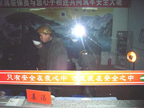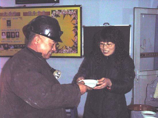 在寒风刺骨的冬天,一碗热呼呼的红糖水、一碗清香的姜汤、一碗热腾腾的稀粥,对刚刚从百米深处走出井口的矿工是何等的渴望和香甜,请看被矿工亲切称为“温馨的港湾”的同煤集团挖金湾煤业公司女工家属井口服务站,是何等的门庭若市,请听这一声声暖心的问候:师父快进来喝碗姜汤,暖暖身子在走!看您的衣服扣子要掉了,我给您缝好了再下井!怎么今天您阴着个脸,是不是家里有事?和我们说一下也许我们能帮助您……