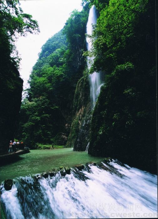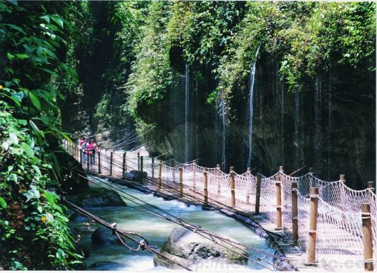 游览名山大川,常常使人心旷神怡,俗虑全消;而游览沟壑险境、自然风光,则象进入人间仙境,使人惊心动魄,感到神奇,引人种 种联想。我早已久慕盛名,终于有了这样一次机会,我随同事们在这桃红柳绿、花香四溢的季节里,专程往访,我们从万盛区出发,东行三十余公里,便来到了久负盛名的黑山谷风景区北门,说是北门,只是相对于南门而已。这里,两边高山,遍地石灰岩,一条沟壑从谷底穿越,无数风光尽显其中,前后13.5公里,素有“原始森林公园”之称。境内,烟雾缭绕,若隐若现;流水潺潺,清澈无比;刀削斧劈,岩画遍布;浮桥摇曳,甚是浪漫;栈道险境,比比皆是,处处风景如画,美不胜收,实乃游览胜地。 我们穿门而过,乘座景区电瓶专用车游览观光,车驰快驶,两面风光如山水画廊,从眼前一掠而过,快速后移。“廊”中可欣赏碧云池、仙女洞、鸳鸯湖、玉观音,饱揽风光,深感山谷如此多娇! 中途下车,我们沿山谷而下,行至三叠瀑,忽听流水声起,若有若无,忽然一峭壁出现,足有50米高,一条玉带直挂峭壁正中,有“飞流直下三千尺,疑是银河落九天”之感。在玉带的最顶端,左中右三股泉水从林中奔腾而出,在岩壁不远处交汇,故称三叠泉。微风拂来,水珠随风而至,飘在脸上,甚是清爽。瀑布与峭壁上方的绿色植被构成了完美的搭配,若不细看,你还真难看出是瀑布。 继续前行,经过滴翠阁、困牛潭以及梦沙瀑布,再过一段栈道,便来到位于野猪峡的鹰爪岩,两旁山势陡峭,山高万丈。远看,山顶云雾缭绕、突隐突现,如空中楼阁。近观,刀削斧劈,壁上层峦叠障。左山可观奇树异境,右峰能看岩壁石画,峰底谷间溪水清澈见底,旁有玲珑小屋和桌椅座凳,可供游人盘坐少憩,沿谷中道路,直上亭阁,然后下石级、上吊桥、过岩洞,便到河中浮桥,一段接一段,两边钢缆固定,水中气垫浮立,左右摇摆、晃晃悠悠,游人手扶绳索,双脚呈“八”字形,艰难前行。如果有人故意恶作剧,便不断有人发出尖叫声,似笑似哭。其实这里就是渝黔省市的分界线,我们一脚踏重庆、一脚跨贵州,真是“人在一处站,脚跨两省市”。在这浮桥上,既让人开心,又使人害怕,真是情趣横生,风采无穷。 走到滴水较湿的地方,我忽觉眼前一亮,这不是地质年代形成的钟乳石吗?虽然没有名山大川的雄伟,也没有真正乳花洞的秀美,但 它毕竟是标志地质年代的变迁。正因为有这样的滴水,才能形成钟乳和石笋。在溶洞顶部,由裂缝滴下来的水含有较多的碳酸钙,当温度和气压变化,水分蒸发后,附在洞顶的碳酸钙一滴一滴增多,便形成钟乳石。泉水顺谷而下,时浅时深,不时溅起朵朵浪花。泉中吸引收人的是,河中生有小鱼,成群结队,嬉戏追逐,不时还进行戏水高难度动作表演,在太阳光的照射下,银光闪闪,不少游人驻足观赏,饱此眼福。 过完“惊心动魄”的河中浮桥,越河而过,便进入“一线天”。这里,又别有情趣,两旁山峰直立,峰刃直插蓝天,峰壁光华平整,壁似刀切,一缕阳光直射下来,刚好照在谷底。上看天一线,下看泉水波光粼粼,两旁绿树成荫,花草扶疏,真不愧为天工杰造,令人心旷神怡,乐在其中。 过得一线天,开始了完全的蹬山,我们顺道石级而上,边走边歇息,并不断回首后视,此时黑山谷早已在我心中铭刻,并不时见有山中泉水流出,流向谷底,流向它应该去的地方。 我曾醉心于桂林山水的甲天下,阳朔山水甲桂林的奇峰异境,但游览了万盛黑山谷以后,我又为这里充满生机的大自然杰作所倾倒,我反复在心底里赞美着:果然造化神秀。