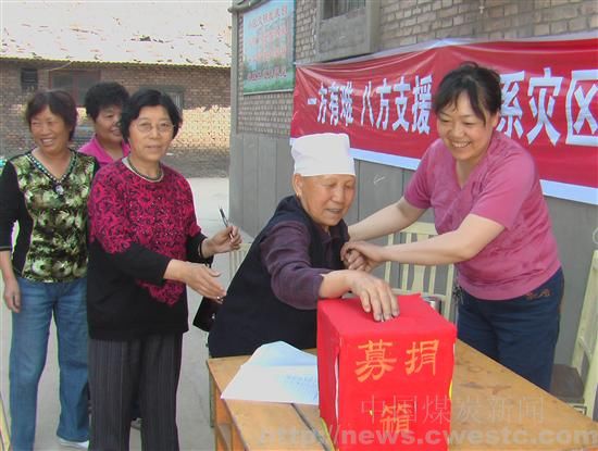 陕西蒲白局医院家属区职工踊跃为灾区人民捐款。图为小区80岁老人,在工作人员搀扶下,来到捐款箱,献上自己的一片爱心.