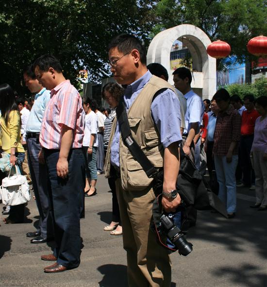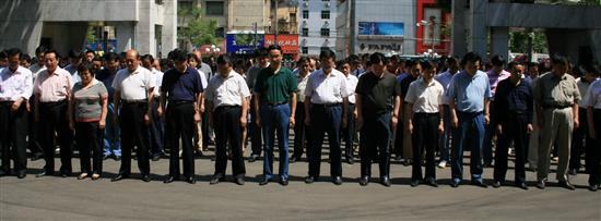 本网讯:5月19日下午14时20分,陕西铜川矿务局党委书记杜树山,局党委常委、矿区工会主席张仿文,副局长薛鸣,副局长兼安监局长刘水利,副局长郭宝辉,同矿务局副总、局机关各处室领导及全体工作人员200多人,早早排队站在矿务局大院打有“深切哀悼汶川大地震遇难同胞”字样的大电子屏幕下面。 14时28分,防空警报拉响后,杜树山等局党政领导和全体工作人员一起向汶川大地震遇难同胞默哀3分钟。 铜川矿务局大院的电子屏幕上“深切哀悼汶川大地震遇难同胞”的字样,从今天起一连出现三天,以此向汶川大地震遇难同胞表示深切哀悼。 铜川矿务局不少干部表示:我们一定要永远铭记这一天,用搞好安全生产、搞好稳定和为四川汶川大地震灾区人民捐款的实际行动哀悼在大地震中遇难的数万同胞。 图为吊唁场景。