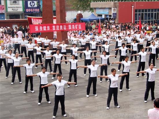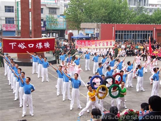 韩城矿务局职工迎奥运大众健身操暨广播体操比赛”,     本网讯  4月29日,也就是奥运会开幕倒记时的101天,陕西煤化工集团韩城矿务局办公大楼前广场上,局各单位12支代表队近千名的职工参加了由矿区工会主办的“韩城矿务局职工迎奥运大众健身操暨广播体操比赛”,各参赛队精心策划、细致表演,用喜悦的心情和优美的动作来表达矿区人共祝奥运会圆满成功,祖国繁荣富强。
