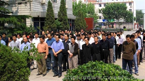 【本网讯】 5月19日全国哀悼日,中国煤炭地质总局水文地质局千余名干部职工集体举行了向地震灾区遇难同胞哀悼仪式。下午2点28分, 水文局机关大院、北张庄基地大院,水文一队办公楼前和钻机施工现场,水文局职工在汽车鸣笛、防空警报鸣响声中集体向大地震遇难者默哀3分钟。 四川汶川特大地震灾情发生后,水文局党政领导和各级党组织十分关注灾情发展情况,及时组织广大干部职工投入到“众志成城、抗震救灾”行动中来。全局干部职工、离退休同志纷纷伸出援助之手,奉献一份爱心,截至5月16日,全局各单位通过不同渠道已向灾区捐款374140元,其中职工个人捐款84140元,目前一些单位的职工还在继续踊跃捐款之中。 为表达对大地震遇难同胞的哀思,5月19日下2点28分,水文局职工向大地震遇难者默哀3分钟后表示:记住这个日子,全国哀悼日,水文局干部职工举全国之哀,团结一致,众志成城,在各自的工作岗位上化悲痛为力量,促进经济建设更好更快地发展,为抗震救灾和支援灾区建设作出贡献。图为水文局机关职工在全国哀悼日向大地震遇难者默哀。