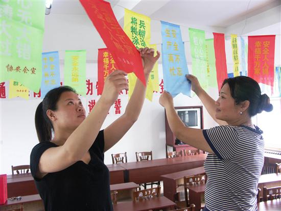 本网讯  5月23日上午,安徽淮北桃园煤矿通风区的两名协安员在会议室内悬挂自己亲手制作的煤矿安全生产警语,在为全国安全生产月活动开展营造浓厚氛围的同时牢牢构筑安全生产亲情防线。