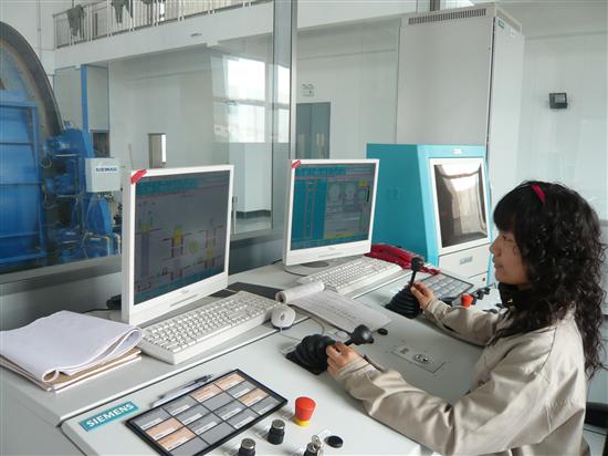 图为该公司一名女职工在熟练操作着由德国西门子公司生产、具有国际领先水平的提升机。