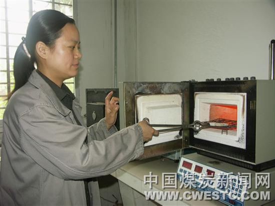图为该矿煤质管理科职工在做煤炭工业分析。