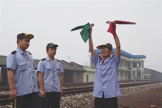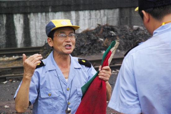 ![]() “黄元老”在认真的讲解 ![]() 图为“黄元老”在调车现场给徒弟讲解动作规范的情景