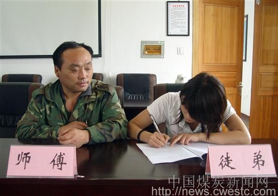 权台矿结合安全生产的实际,实施青工技能提升工程,通过导师带徒、技术比武等形式,提高青工的专业技能和创新能力。图为一对师徒正在签订《青工导师带徒合同》