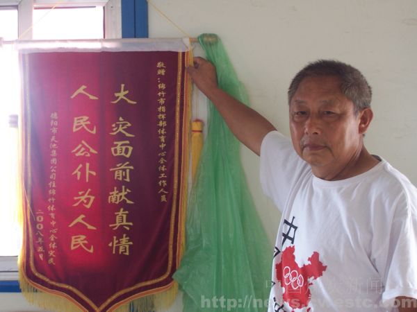 在绵竹市体育中心安置点的帐蓬里,我们见到了一些天池煤矿的灾民。在这里,我们听到了一个心酸的故事。住在这里的天池煤矿灾民,捐款买锦旗送给了这里的管理部门。如果说人们觉得那方面工作做得好,受到了感动而自发地送上锦旗以表谢意,这是很正常的。然而,天池煤矿灾民送锦旗是因为得不到重视而采取的一种手段。这把锦旗的意义正好打了个颠倒。不过,袁自坤老人说,那一面锦旗还是发挥了作用的,第二天管理部门就打电话过来,问我们被子够不够什么的了,啥,让过去领。天池煤矿灾民的苦水,不是说他们给政府有多高的要求,而是觉得和有的灾民比起来,天池煤矿的灾民就低人一等。地震后灾区都收到了好多全国各地捐来的钱物,据说给70岁以上的人都发了一条毯子,天池煤矿的人没
