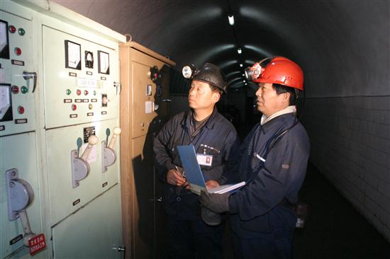 陕西铜川矿务局王石凹煤矿在安全月活动中,把安全管理的重点放在现场安全检查上,认真消除隐患,确保安全生产。图为机电管理人员对机电设备进行现场检查。据了解,该矿目前采煤、掘进机械化率已达100%,良好机械运转性能,不但减少了事故的发生,也推动生产效益的提高,五月份该矿采15万吨,以实际行动支援了地震灾区的建设。