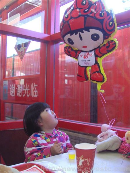 北京奥运会日益临近,奥运氛围也越来越浓厚。各路商家抓住这一有利时机,纷纷打出“奥运牌”。这不,在品尝美食的同时,这个天真可爱的小姑娘,仰头注视福娃的瞬间,让我们读出了她小小心灵深处,对福娃的由衷喜爱和对奥运的向往,同时也让我们欣慰地看到,矿山下一代物质和文化生活的丰富多元。
