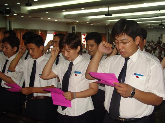 ] 在近日枣矿集团田陈煤矿举行的新党员入党宣誓仪式上,有2名新党员特别引人注目,原来他们是一对夫妻,男的叫冯强(右一),是一名财务人员,妻子邬婷婷(右二)是综修车间的员工。夫妻二人同时入党,在矿区传为佳话。