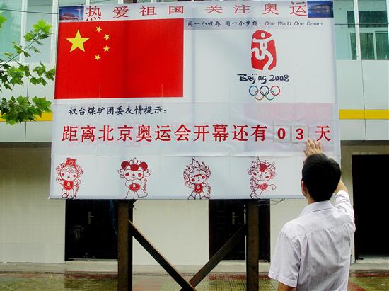 奥运会即将来临,权台矿团委制作了奥运倒计时牌版,表达了期盼奥运、参与奥运、奉献奥运的热情。