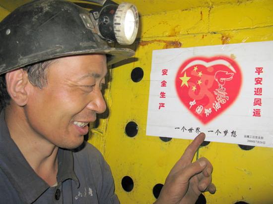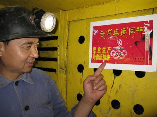 (图为职工观看该矿在井下人行车车厢内张贴的保安全迎奥运“小帖士”)