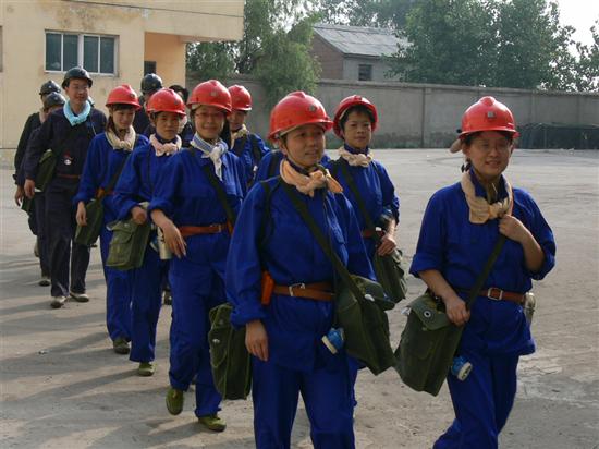 图为送清凉小分队身背慰问品徒步前往18228综采面