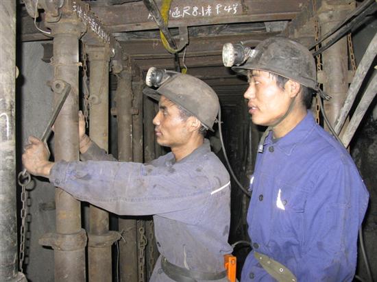 (图为该矿采三区采煤工任海利在向他的新职工徒弟现场传授巷道支护技术)