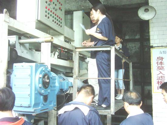 近年来,由于入洗煤炭质量发了变化,其入洗煤中含有大量的泥质和矸石粉,造成煤泥回收时间长,处理能力达不到洗煤工艺要求,给洗煤生产带来了巨大困难。 对此,公司决定在该厂三台框式压滤机的基础上,投资购买一台带式压滤机和一套型为xxL-300-72、30m3全自动絮凝剂添加系统,以配合带式压滤机使用。运用带式压滤机可以连续处理煤泥,能较好适应矸石粉和泥质的特点,解决煤泥回收问题。 图为员工现场学习带式压滤机操作
