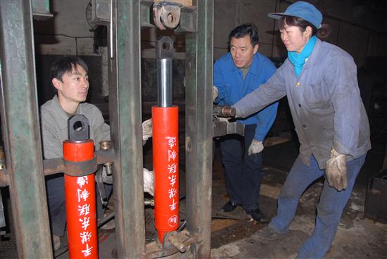 本网讯 平煤集团东联公司单体支柱制造厂针对产品单一、技术含量较低的情况,今年开发出了液压支架护帮千斤顶,每年可增加产值2000多万元。图为1月12日,该厂职工在对护帮千斤顶进行压力试验。