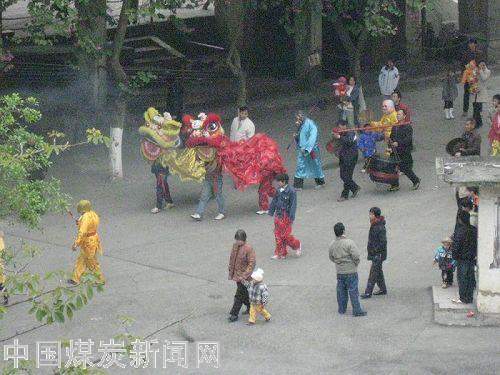 广西右江矿务局小龙矿年初一活动,举行猜迷语、投篮球、套鸭、套啤酒等各种文体活动丰富了矿区节日浓厚气氛,促进了矿区和谐文明健康的发展。同时,初一那天局长叶仿拥也到该矿向留在矿值班的调度员等节日问候,图为井口狮狮拜年的一个场面。