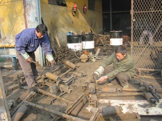 图为该矿运输工区工作人员正在维修上井的运输皮带旧托辊架