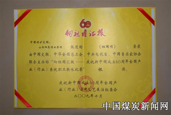 本网讯:10月份,在中国文联、中华全国总工会、中央电视台、中国音乐家学会联合主办的“向祖国汇报——庆祝新中国成立60周年全国产业(行业)系统职工歌咏比赛和在中国文学艺术界联合会、中华全国总工会、中央电视台、中国舞蹈家学会联合主办的庆祝新中国成立60周年全国产业(行业)系统舞蹈展演中,阳煤集团五矿代表集团公司选送的《祖国颂》歌咏和舞蹈节目分别夺的银奖和铜奖。 阳煤集团五矿以高涨的政治热情,报送的《祖国颂》歌咏和舞蹈节目,紧贴祖国60岁生日的庆祝,以激情奔放的气派,嘹亮悠扬的歌声,民族风情的舞技,赢得了文艺展演组委会的“高看”。充分展现了企业在抓物质文明建设和精神文明建设中的显著成果,展现了煤矿企业热爱伟大祖国的激情,是为祖国60岁生日敬献的厚重礼物。