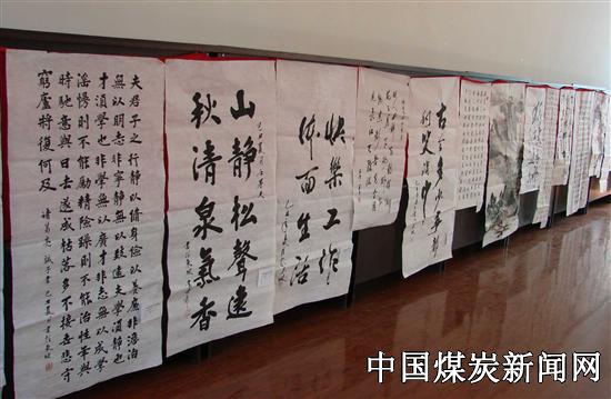在举国欢庆祖国60岁生日的时刻,该矿先后举办歌咏比赛、“我与祖国同奋进,我与企业同发展”征文、播放红色经典电影,开展百日安全等系列活动,喜迎国庆。日前,又组织书画展览,讴歌伟大祖国,献礼祖国60华诞。展览现场,职工仔细观看,细细揣摩,品头论足。典雅的山水古韵,生动的人物素描,仓劲的狂草,婉约的小楷……26副绘画作品,浓重墨彩,厚重雄浑;40副书法作品,铁划银钩,执着攀登。在洁白的画纸上,跳动的灵感中,职工用线条来抒发对美好生活的向往,用不同的表现手法和独特视角,演绎着工作、生活的写照,用水彩讴歌对伟大祖国生日的祝福,展示了东坡人艰苦奋斗、爱岗敬业的精神风貌,生活公司谭恒昌的作品“快乐工作 体面生活”说出了他们的心声…… 图为展览一角