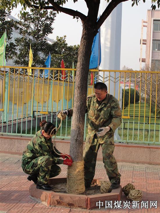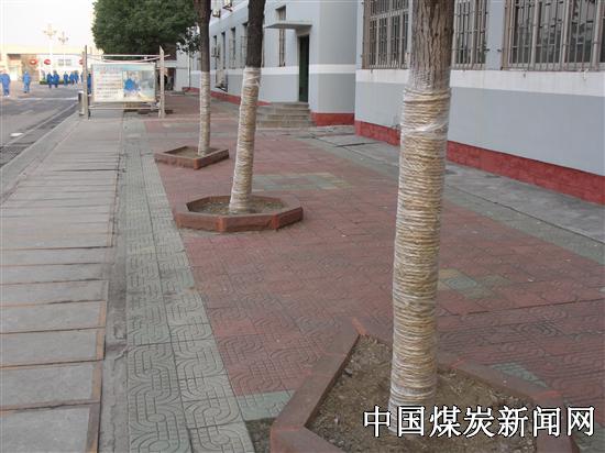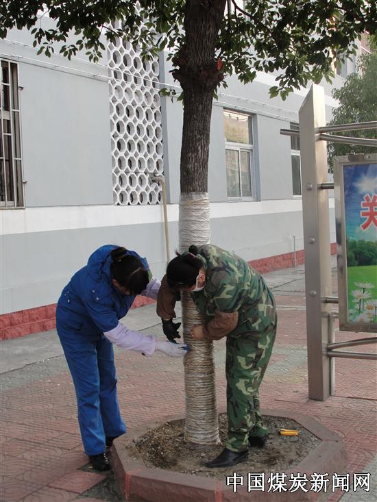 为保证树木能平安度过冬季,该矿物业公司创新工作思路,给矿区工广区域上的树木包上了草绳、塑料薄膜,穿上了厚厚的“防寒服”,避免了冬季严寒带来的不要的损失。