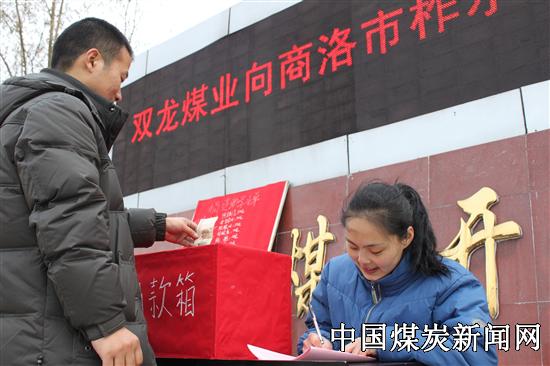 【本网讯】 日前,陕西双龙煤业开发有限责任公司响应陕煤化工集团号召,动员广大青年员工向因办学条件困难的陕西商洛市柞水县下梁中学捐资助学。倡议发出后,双龙煤业200多名青年员工踊跃投入到了捐款活动当中,图为员工将自己的爱心款投向捐款箱。