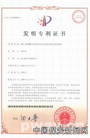 ![]() 【本网讯】 威胁煤矿和矿工安全的瓦斯治理世界性难题有望得到有效解决:将特殊材料配比的瓦斯消溶剂注入煤层,煤层内瓦斯浓度迅速下降,瓦斯消除率达99%以上。获得这项煤矿瓦斯治理重大发明专利技术突破的是洛阳保矿安矿山设备有限公司。 洛阳保矿安公司董事长王雪玲向记者展示了公司2008年元月拿到的“煤矿瓦斯爆炸突出治理方法及其配用的瓦斯消溶剂”发明专利证书,以及徐州矿务集团张集六矿、平顶山矿业集团天安十矿、义煤集团渠里煤矿以及四川、山西、陕西等6家煤矿出具的实验报告及现场操作数据记录。 记者在其中义煤集团渠里煤矿现场操作数据记录上看到,向煤层内注入一种“瓦斯消溶剂”后,煤体内瓦斯浓度均迅速下降99%以上,而且掘面瓦斯、巷道瓦斯也均有明显下降。 这份应用报告显示:2007年1月在该矿20141掘进面进行的为期5天的实验中,其中 洛阳保矿安公司技术总监张震宇高级工程师介绍,传统瓦斯治理方法24—72小时才能掘进 ![]() 资料显示,我国煤矿高瓦斯矿井占煤矿总数的70%以上,瓦斯治理是煤矿安全面临的最大难题。2004年,洛阳保矿安公司组织煤矿技术人员联合国内高校、瓦斯治理研究所专家对煤矿瓦斯突出世界性难题进行技术攻关,先后投入研发资金300余万元,并先后在江苏、安徽、河南等多家高瓦斯煤矿、不同矿井环境下进行试验,不断进行规范的煤矿试验和扎实的数据采集、分析、评估工作,终于摸索出针对不同煤矿地质构造条件,调配出由多种有机溶剂和生物物质混合而成的瓦斯消溶剂。 经洛阳质量技术监督部门检测认为,该公司这种瓦斯治理专利技术安全高效,可操作性强,对人体无害,瓦斯消溶剂成本低,并对煤质量无影响,经济、社会和安全效益显著。2007年,洛阳保矿安被洛阳市命名“科技型企业”,该发明专利获得第二届中国国家专利与名牌博览会金奖。 目前,该煤矿瓦斯消融发明专利技术已经引起了国家煤炭总局、国家安监总局主要领导、河南省、洛阳市主要领导及、省、市煤炭局、安监局、技术监督、知识产权等部门领导的高度重视。原河南省委书记徐光春、副省长史济春等分别作出重要批示全国煤矿瓦斯治理专家中国工程院院士张铁岗、郑州大学化学系教授、洛阳师院化学教授等都对该项技术的研发进行了指导。洛阳保矿安公司在所在的市、区科技部门的支持下,已经按照国家、省、市煤炭瓦斯治理专家的指导,已制定了产品标准、完善了标准化施工规程编制、经济效益分析等工作。目前该产品及应用技术已达到成熟技术的要求,具备向全国推广使用的条件。