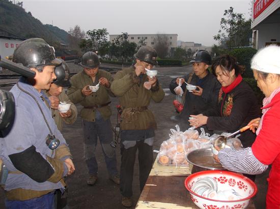 初六开班的第一天,该矿家协的矿嫂们早早就来到井口,挂上新年祝福的标语,包上圆圆的大汤园,和着优美的音乐,为每位下井职工递上热腾腾的大汤圆和香烟,同时送上亲切的问候和祝福:“兄弟们新年快乐,祝你们新年平安吉祥、事业红红火火,家庭幸福美满,安全生产双丰收”。矿工们脸上洋溢着幸福的笑脸,说,09年我们一定努力工作,搞好安全生产,向汤园一样事事园满。
