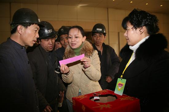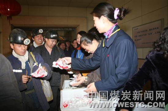 [本网讯] 正月十五日,山东兖矿集团济二矿工会女工委在矿副井口开展了一次“花灯吐艳映团圆、心系一线嘱安全”活动,为上下井的职工送去了200余斤香甜可口的汤圆,受到了职工们的欢迎。 下午3点钟,该矿工会女工家属协管会的女工在副井口张贴了“济二矿工会女工委花灯吐艳映团圆、心系一线嘱安全活动”的横幅,搭起了桌椅板凳,摆放好准备的一包包汤圆,旁边还有一个幸运抽奖箱子,里面有安全知识问答,只要职工能回答出来问题,就可以得到一份奖品。当上下班的矿工们经过时,女工们一边热情的递上代表“团团圆圆”的汤圆,一边嘱咐矿工们要按章作业,做好自主互保,搞好安全。在幸运抽奖箱前,矿工们争先恐后的抽奖,抢答安全知识题目。节日的深情问候,激发了一线矿工们搞好安全生产工作的积极性,纷纷表示一定时刻将安全牢记心中,自觉遵章守纪,按章操作,为全矿顺利实现首季安全生产开门红做贡献! 图一:汤圆送矿工 ![]() 图二:安全知识我来答