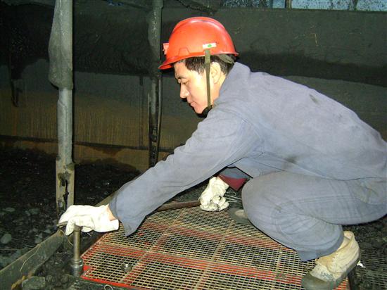 五矿选煤厂洗煤队检修员工钻入狭窄的空间正在更换块炭分级筛的二层编织筛网