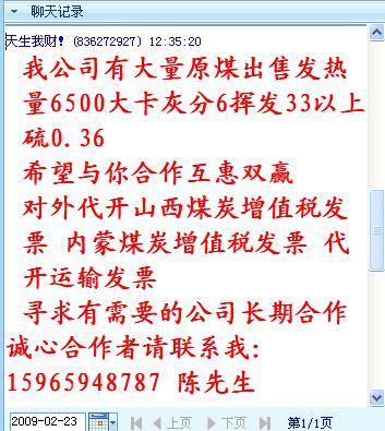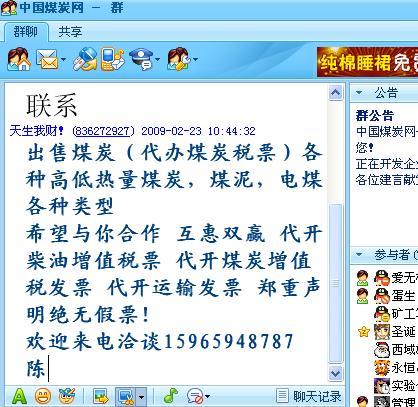 笔者在“中国煤炭网”的QQ群中看到,有位叫“天生我财”的网友已在2月18日——23日这段时间里连续多次上传出售煤炭的信息,信息中将其所售煤炭的发热量、灰分值、挥发分以及含硫量等逐一进行了说明,而且他们还对外代开山西煤炭增值税发票、内蒙煤炭增值税发票、代开柴油增值税票等,并留下了自己的手机号码,表现出了极大的诚意(如图)。 ![]() 而众多网友对此反应不一,有的网友对上传信息者的态度是好言相劝,劝其早点退出该群;有的网友佯装没有看见,对此类信息置之不理;有的网友则建议其找到固定客户后再私聊,不要毫无目标地往公共群里发“垃圾信息”;还有的网友比较开明,他们深知全球金融危机给煤炭销售市场带来的影响,鼓励该煤炭营销人员继续努力,充分利用网络资源挖掘出更多的潜在客户。 对此,我也咨询了一下我们济宁矿业集团煤质运销部的梁开锋科长,他说,利用QQ上传煤炭销售信息,实际上是在做煤炭广告,我还是第一次听说,这种销售方式很新鲜,属于“广种薄收”型。不过,他对这种通过QQ上传煤炭销售信息的做法持怀疑态度,主要是对其真实度提出了质疑,因为目前的煤炭销售方式主要还是客户亲自到煤矿上去购煤,这样,客户可以现场化验煤炭的质量,矿上的销售也都是以质定价,煤质好的价格就高些,而且客户来矿上购煤还可以享受到更好更全面更贴心的服务。 ![]()