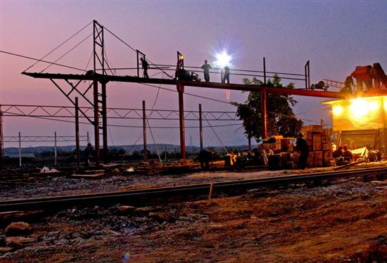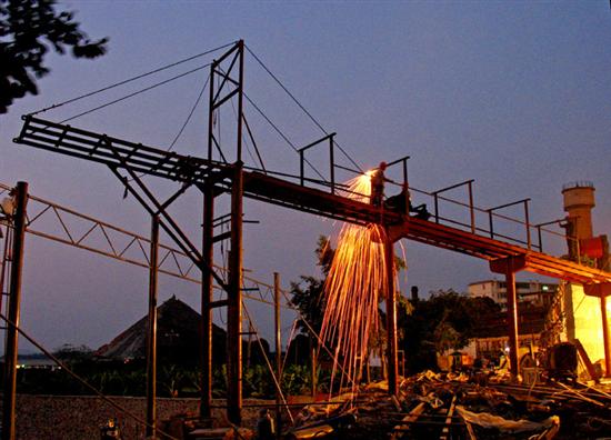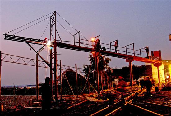 【本网讯】 广西右江矿务局塘内矿的机械化改造工作目前已进入功坚战阶段。以下是工人们正在夜以继日,连班加点安装、焊接井底到地面煤仓的大型皮带机架的几个镜头。