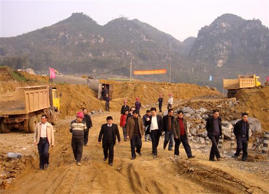芙蓉公司董事长魏正均、筠连县副县长胡波、施工单位川南建工公司董事长黄敬等人员陪同察看了施工现场。芙蓉公司董事长魏正均、承建工程的川南建工公司董事长黄敬分别汇报了水泥项目从去年11月开工典礼以来的工程进展总况。该项目工期14个月,时间紧、任务重,芙蓉公司和承建的川南建工组织了精干的工程技术力量,以高效的施工速度,在开工的当月就完成了工业广场征地460亩,12月份第一期农户搬迁35户,使场区“五通一平”工作有序推进;重点汇报了从今年2月11日新年恢复施工以来的工业广场平场已完成开挖近10万土石方,现正以每天开挖1万方量快速推进,要力争在4月底完成“五通一平”工作。安置拆迁户场地的“三通一平”也已即将完工,场内还有150多户农户住房未搬迁,影响施工。 筠连县胡波副县长也对地方政府大力支持、协调重点工程建设今年专门成立已挂牌办公的拆迁现场工作组开展工作情况作了介绍。表示要按企业施工进度要求在3月底完成全部住房拆迁工作,保证企业按时全面铺开土建工程的施工。 邓嘉德总经理在听取了芙蓉公司项目建设和地方政府对住房拆迁的情况汇报后,对芙蓉公司快速求实抓项目建设,千方百计推进项目建设进度给予了充分肯定。他要求芙蓉公司要进一步抢抓机遇,乘势而上,以只争朝夕的精神推进项目建设进度;要提前思考、着力抓好制约工程建设的瓶颈工程,加大与县政府相关部门的协调工作;加快余下的150多户的拆迁安置工作,确保3月底完成拆迁任务,4月底完成场区平场,为土建工作全面铺开创造条件。