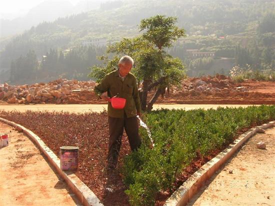 为了把矿山建设成为花园式矿区及给职工创造一个良好的生活和工作环境,最近,福建省重点建设项目永安煤业公司苏桥煤矿筹建处认真做好绿化、美化工作。目前已完成了2#、3#、5#、6#宿舍楼四周绿化、办公楼至宿舍楼水泥便道两侧绿化和矿区三叉路口三角带绿化工作,完成了第一期绿化工程,此次绿化工程约为1382平方米。图为工人对已完成的三叉路口三角绿化带进行浇灌。