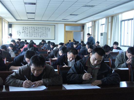 图片为:新招农民工正在接受安全培训后,工会组织上岗前的考试场景。