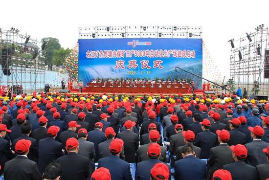 右江矿务局以科学理性,极速发展的理念,自去年9月份开始,以短短180天时间,就把一个年产不足30万吨的塘内矿,改造成为年生产能力超过100万吨、日产煤5000吨的大矿。而且是目前广西机械化程度最高和全程实现数字化管理的现代化煤矿。建设速度之快为广西乃至全国罕见。 右江局职工同心同德,迎难而上,践行科学发展观,在科学发展观学习实践试点活动中,作为学习实践科学发展观的实践项目使具有全国先进水平的塘内煤矿建成投产,为广西煤炭工业的发展谱写了新篇章。 图为庆典仪式。