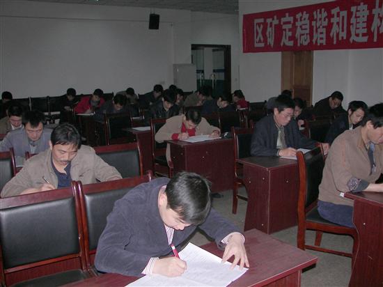 (本网讯)为进一步强化特种作业人员的安全意识,提高操作技能,从3月10日起,四川煤炭产业集团达竹公司小河嘴煤矿举办了特种作业人员技能培训班,对包括电钳工、机车司机、运输司机在内的全矿500余名特种作业人员进行了业务知识和操作技能培训。培训结束后,该矿还在3月23日—25日举行了严格的特种作业人员培训结业考试,经测试,99%的学员成绩较好,达到了预期效果。图为考试现场。