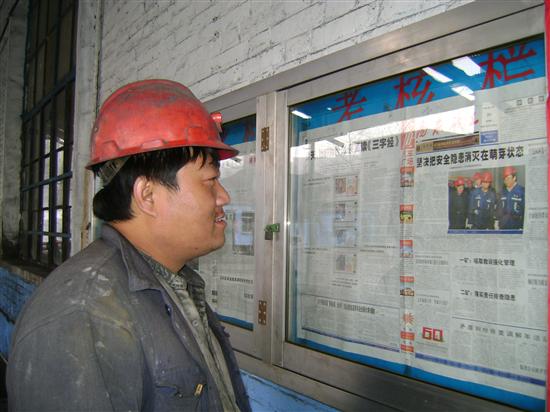 3月2日上午,阳煤集团五矿选煤厂机电队员工利用工余时间正在机电检修厂房的阅报栏前观看《阳泉矿工》报有安全方面的报道内容。进入3月份以来,阳煤集团五矿选煤厂认真吸取屯兰“2.22”事故教训,上措施强管理,在积极组织安全隐患排查的同时,利用班前班后、二、五安全活动日、标语、吊挂、横幅、板报以及电子滚动牌板等形式大张旗鼓地对员工进行安全宣传教育,营造浓厚的安全宣传氛围,杜绝员工意识中的安全漏洞,真正让安全理念入脑、入心.
