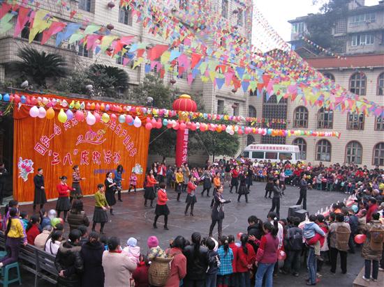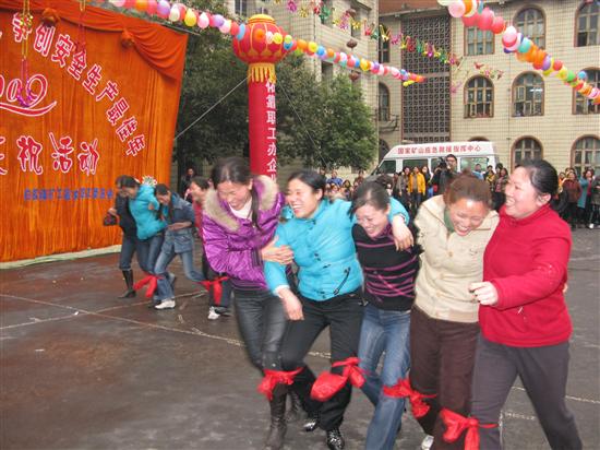 该矿党委书记、工会主席朱世贵出席并作讲话,他希望广大女职工以饱满的热情和最佳的工作状态在本职岗位上建功立业,并祝全矿女职工节日快乐,活动取得圆满成功。演出内容有歌舞、独唱、诗朗诵及互动趣味活动,演出始终突出“乐”、“和谐”主题,节目一个比一个精彩,演出现场鼓掌、加油声此起彼伏,整个场面其乐融融,春的气息扑面而至,受到了职工家属的好评。在家矿领导、部门负责人同现场女职工互动,共同参加《团结一心向前走》趣味绑腿跑比赛,把活动推向了高潮。图为该矿喜迎“三八”活动现场。