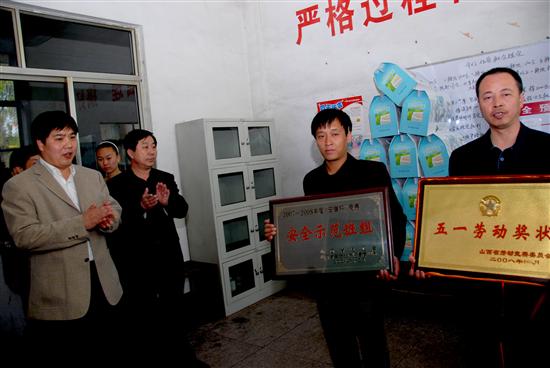 4月24日,山西阳煤集团五矿敲锣打鼓,鞭炮齐鸣,带着礼品为荣获山西省“五一劳动奖状”和“安全示范班组”的掘进二队一组一班贺喜。这是阳煤集团唯一获得此项荣誉的班组。阳泉市总工会、阳煤集团工会对班组经验进行了交流。