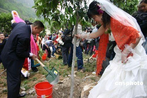 4月26日,在北川美丽的吉娜羌寨,震后20对新人喜结连理。图为新人共植“同心树”,感恩社会,同时也寓意他们的感情如同这棵树一样天长地久。中新社发霍潺摄