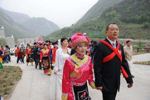 4月26日,四川北川县政府在擂鼓镇吉娜羌寨为20对“5·12”大地震后重组家庭夫妇举行集体婚礼。CFP 版权作品
