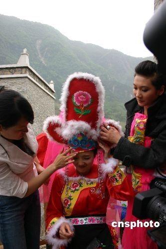 4月26日清晨,在北川美丽的吉娜羌寨,新娘倪爽正在穿戴羌族级别最高的婚礼服装,精心打扮,以最美的姿态迎接幸福时刻的到来。 中新社发 霍潺 摄 中新社北川四月二十六日电 蓝天为媒,吉娜羌寨作证。北川震后首场集体婚礼今日在此举行。 羌笛悠悠,歌声袅袅。喜庆的气氛洋溢在羌寨的每一个角落。 上午十一时五十分许,二十对新人一一走上红地毯,向众人展示着他们最幸福的时刻,而在他们幸福笑容的背后,几乎都有一个令人伤感的故事。 姜勇倪爽:亮丽夫妻动人情 头戴漂亮的礼帽,身着鲜艳的羌服,身材高挑的姜勇和妻子倪爽是今天最年轻的夫妻,也当仁不让地成为婚礼上最亮丽的风景。 姜勇是中共北川县委组织部工作人员。二十七岁的他本有一个幸福的家庭:娇妻、幼女。平静和美的生活被大地震打断。 姜勇告诉中新社记者,去年五月十二日中午,他骑着摩托车载着妻子去上班。刚刚上路,地震发生了,地动山摇之后,骑在车上的姜勇发现自己躺在路边,而妻子已经在几十米外。当时,妻子还很清醒,说手臂不能动了,还在出血。姜勇马上脱下衣服,给她包扎上,背起她就往医院跑。旁边有人提醒他,“医院已经被埋了!”他才反应过来,知道只能靠自己了。 一个小时后,妻子慢慢不行了,说肚子疼,出不了气。唯一留下的话就是:“照顾好女儿。”就这样,姜勇眼睁睁地看着妻子离去。 “那个情况下,谁也救不了她。”天色渐暗,姜勇找来一张床单,把妻子包上,背到集体掩埋处。从第二天起,姜勇和众多的北川男人一样,投入到抢险救灾中。 而现任妻子倪爽,是今年春节前他俩共同的亲戚介绍的。亲戚告诉姜勇“女孩子很温柔,心好。”倪爽与姜勇同龄。地震时,她正好去绵阳采购结婚家具,躲过一劫。而当时的未婚夫却与她从此生死相隔。 婚礼前,姜勇抱着两岁的女儿出现在现场,引来众多关注的目光。倪爽悄悄告诉中新社记者,“刚开始女儿叫妈妈,有点不习惯。但孩子很可爱,现在已经非常喜欢她了”。姜勇在旁边偷偷乐着。 如今,姜勇、倪爽暂住在北门板房区,小小的一间屋子,盛满了新生活的快乐和喜悦。 震后,姜勇又买了一辆摩托车,仍然会每天骑车送妻子上班、下班,周末的时候,两人一起爬山、吃农家饭。“经历一场大地震,我们要让生活更美好。”姜勇和倪爽几乎同时说。 魏应凡冯德琼:年纪最长幸福更长 今年六十一岁的魏应凡是遂宁人,二00一年从教师岗位上退休后,和老伴一起来到北川,照顾孙子。 三代同堂的生活本来非常宁静,然而,一场大地震改变这一切:老伴遇难,令魏老师悲痛欲绝。 县城的家没有了,魏老师搬到绵阳和大儿子住在一起。去年底,熟识的马老师介绍他与擂鼓的冯德琼认识,相同的经历让两颗心渐渐温暖。冯德琼也在绵阳,能干的她帮助妹妹管理着饭馆。 都是六旬左右的人了,魏老师说,我们更珍惜平静的生活。四月十日,老俩口到民政部门办理了结婚证,他说,现在最大的心愿就是两个人相互照顾、搀扶着过一个幸福的晚年。 杨昌斌周小红:春天般初恋的感觉 杨昌斌是北川羌族自治县开坪乡人。地震时,在家里务农的他毫发无损。而他的妻子恰恰在五月十二日那天,去县城看望老母亲,老母亲在那里照顾他们八岁儿子和三岁女儿。一场地震,活生生地让所有亲人离他而去。 令人心碎的伤痛一直蔓延着,杨昌斌难以解脱,直到春节后亲戚介绍他与周小红相处。地震让周小红失去了相濡以沫的丈夫和十岁的儿子,而她自己腰二椎粉碎性骨折,现在还隐隐作疼,干不了重活。 天公作美。这两个最伤心的人第一次见面居然都互有好感,也许是同样的命运让他们更容易亲近。杨昌斌告诉记者,跟周小红在一起,他居然有些初恋的感觉,“像春天的感觉。” 美好的感觉也令他们的亲人开心。杨昌斌说,“最让我感动的,是我带着她去看望前妻的父母,她非常乐意。”杨昌斌现在依然照顾着前妻的父母,因为他们没有其他的子女。 而同样的事情也发生在周小红身上。她的前婆婆已经把她当成自己的女儿,婆婆“希望她一生幸福。” 刚刚过去的清明节,杨昌斌和周小红一起去老县城祭奠,把结婚的决定告诉了双方的亲人。 杨昌斌喜气洋洋地说,等他们从海南旅游回来,会请亲戚们聚聚,“这个形式不能少”。 杨昌斌还有许多打算:开坪的新房已经修好了,等天气热了,就把小红和她父母接去休养,“安昌板房简陋些,不利于她身体的恢复”;还打算过两年,等小红身体彻底恢复了,再要个孩子…… 羌族汉子杨昌斌看起来很憨厚,笑起来很真诚。从他的笑容里,能清楚地感觉到荡漾在他心里的春天。 春天,万物萌生,草长莺飞。而在极重灾区北川,震后首个春天的爱情正在孕育着新的生活,新的希望。